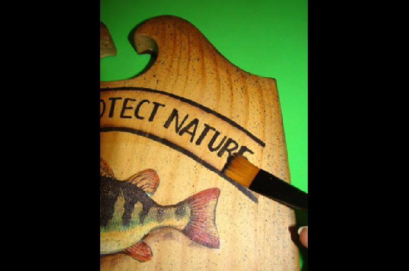 Cargar un borde del pincel chato con acrílico siena tostada. Con la técnica de flotado, sombrear los contornos de la pieza de madera, la parte inferior de las figuras y bordes internos de las líneas de la inscripción, para dar mayor profundidad. Dejar secar bien y proteger con una mano de barniz acrílico mate.