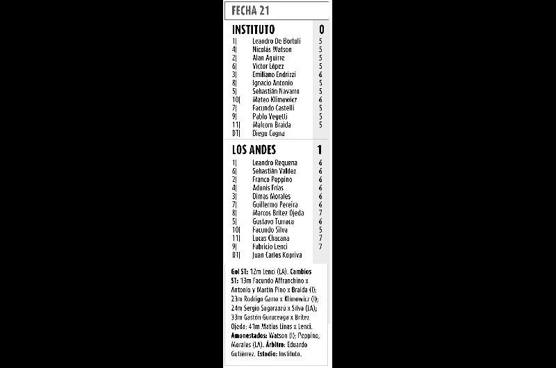 Los Andes nunca entró en juego, evitó tomar cualquier tipo de riesgo y por eso tuvo poco la pelota. Pero incluso en los instantes que la manejó no contó con claridad para llevar peligro al arco cordobés. Apenas alguna aproximación desde los pies de Silva y los destellos de Brítez Ojeda que, claro está, no fueron suficiente. El local, con más tenencia, fue un cúmulo de desprolijidades y falta de ideas.