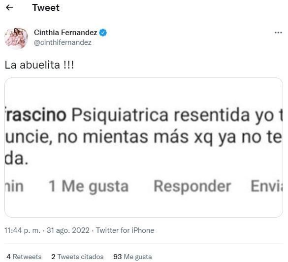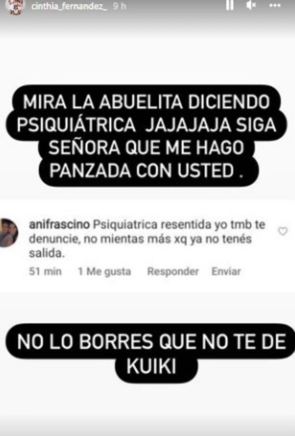 Cinthia, sabiendo que el mismo podría ser borrado como tantas otras veces pasó, decidió sacarle una captura y subirlo a todas sus redes. "La abuelita diciendo psiquiátrica. Siga señora, que me hago una panzada. Y no lo borres, que no te de kuiki", subió a sus historias de Instagram.