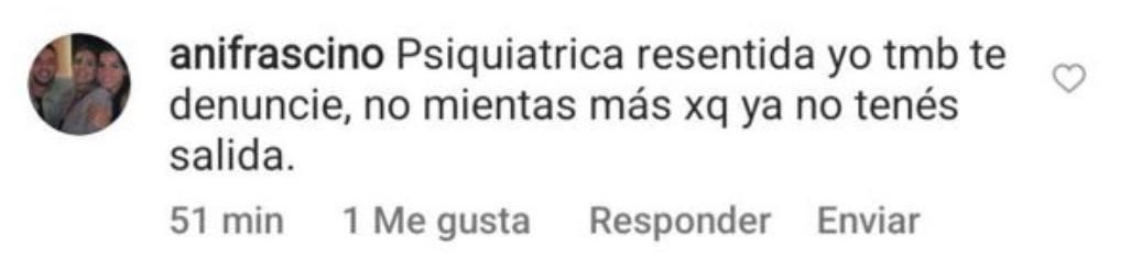 "Psiquiátrica resentida, yo también te denuncié. No mientas más porque ya no tenés salida", decía el comentario que le envió públicamente la madre del ex futbolista.