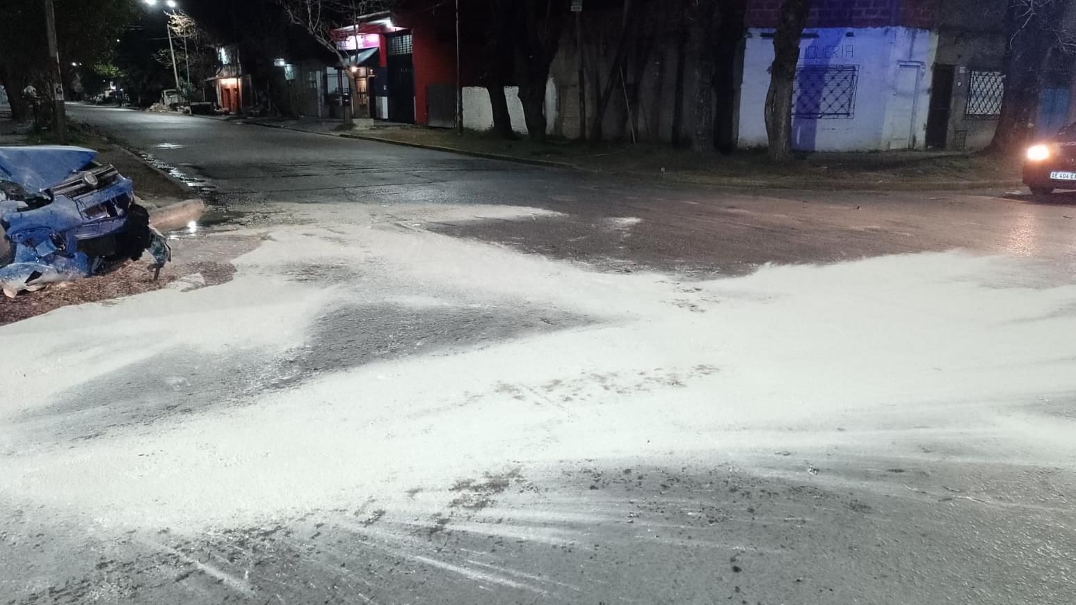 Luego, desde Defensa Civil, con el fin de la neutralización de los líquidos derramados tras el choque y también de evitar otros siniestros, esparcieron sobre el asfalto un polvo. Se trata de cal para evitar el efecto residual y arena para que absorba el líquido aceitoso.