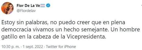 "Estoy sin palabras, no puedo creer que en plena democracia vivíamos un hecho semejante. Un hombre gatilló en la cabeza de la Vicepresidenta", escribió Flor de la V.