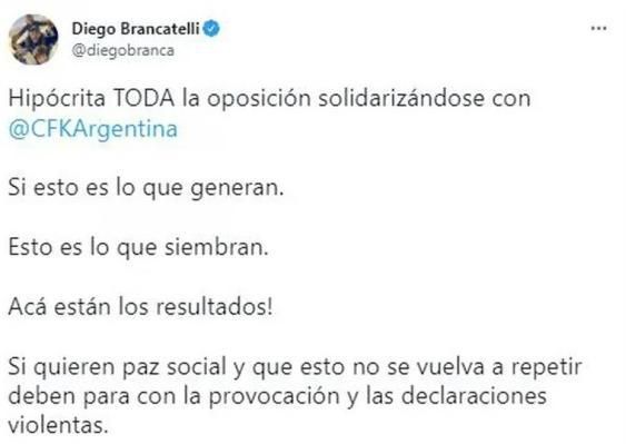 "Hipócrita toda la oposición, solidarizándose con Cristina Kirchner. Si esto es lo que generan. Esto es lo que siembran. Acá están los resultados. Si quieren paz social y que esto no se vuelva a repetir, deben parar con la provocación y las declaraciones violentas", tuiteó, enojado, Brancatelli.