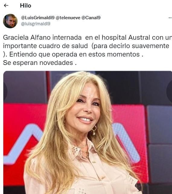 "Entiendo que está siendo operada en estos momentos. Se esperan novedades", había agregado hace unas horas el periodista en Twitter.