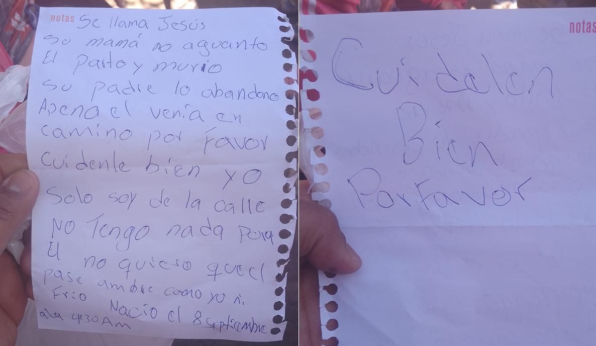 La joven vio que el chiquito "estaba adentro de una bolsa reciclable de tela y adentro tenía una nota". La carta decía que el bebé se llamaba Jesús, que su madre había muerto en el parto y que su padre lo había dejado abandonado. También revelaba una fecha de nacimiento: 8 de septiembre a las 4:30.
