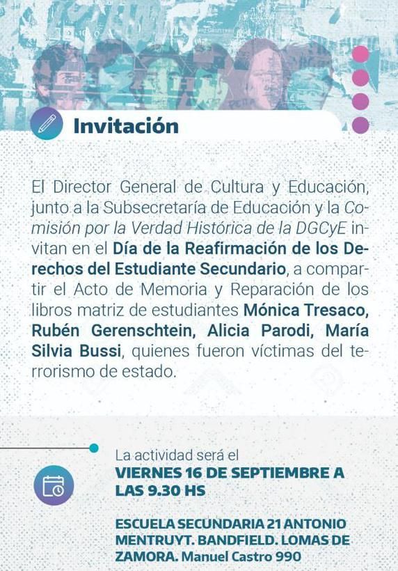 La cita será este viernes 16 de septiembre a las 9:30 en la Escuela Secundaria 21, ubicada en Manuel Castro 990, en Banfield Oeste. El evento, organizado por la Dirección General de Cultura y Educación de la Provincia de Buenos Aires, se realizará en el Día de la Reafirmación de los Derechos del Estudiante Secundario.