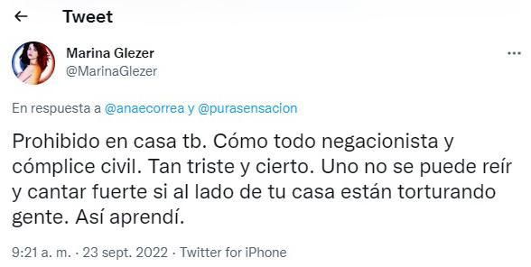 "Prohibido en casa también. Como todo negacionista y cómplice civil. Tan triste y cierto. Uno no se puede reír y cantar fuerte si al lado de tu casa están torturando gente. Así aprendí", tuiteó la actriz.