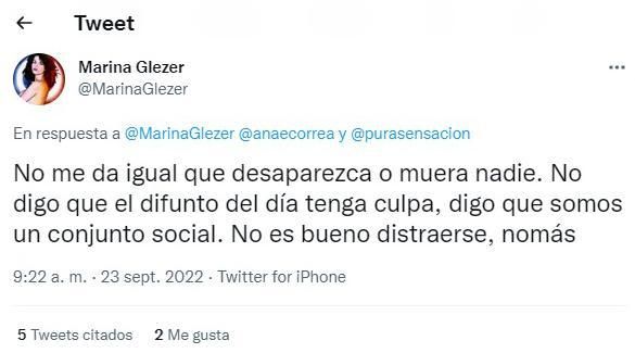 Notando el grado de repercusión que habían tomado sus palabras, Marina Glezer intentó aclarar la cuestión. "No me da igual que desaparezca o muera nadie. No digo que el difunto del día tenga culpa. Digo que somos un conjunto social. No es bueno distraerse, nomás", comentó luego.