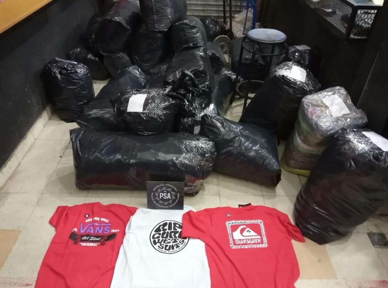 En total, los agentes incautaron 4.070 remeras; 570 buzos; 229 shorts; 2.837 retazos impresos con una marca comercial y 78 bastidores para realizar las estampas.