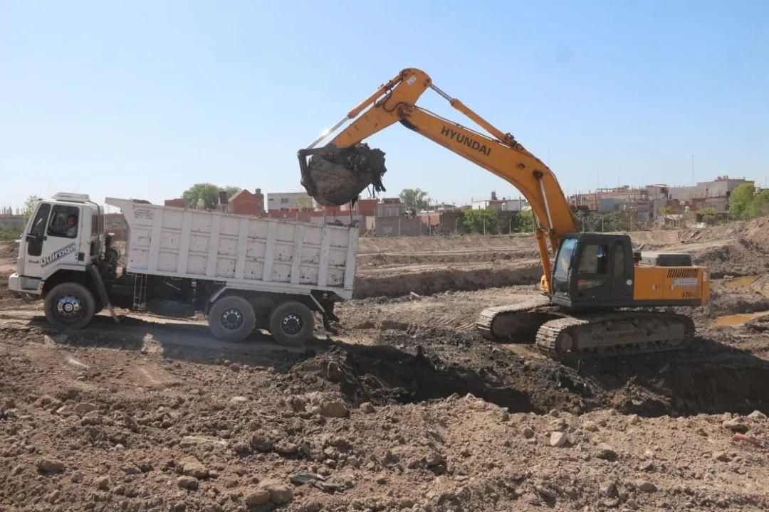 Actualmente están excavando el cuenco regulador que tendrá una superficie total de 2,6 hectáreas. Este reservorio se conformará mediante la extracción del material de suelos existentes para generar suaves taludes de fondo hacia el arroyo y hacia el canal de descarga del Riachuelo.