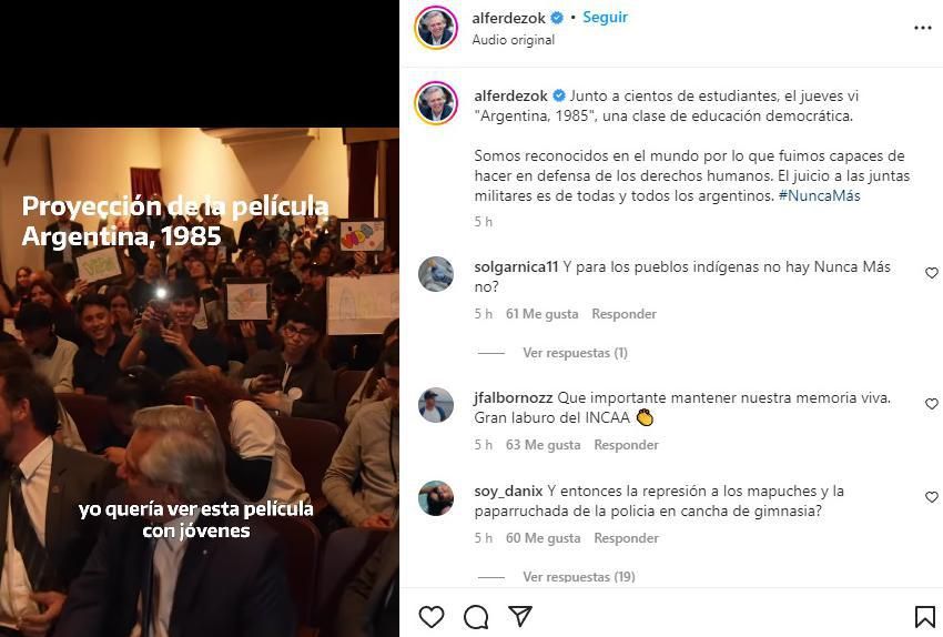 "Quiero que en Argentina Nunca Más sea Nunca Más. Quiero vivir en una sociedad sin violencia. Quiero esa sociedad de la que habló (el fiscal Julio) Strassera. Quiero que se ponga final a la violencia política de una vez y para siempre", expresó el mandatario al finalizar la proyección, donde compartió una charla con los estudiantes y cuya intervención publicó hoy en su cuenta de Instagram.