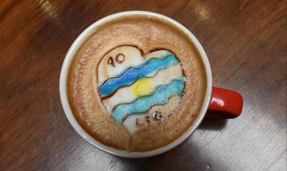 Una cafetería de Lomas ensaya diseños blancos y celestes para alentar al equipo: el arte del arte latte saldrá con logo, copa y banderas argentinas.