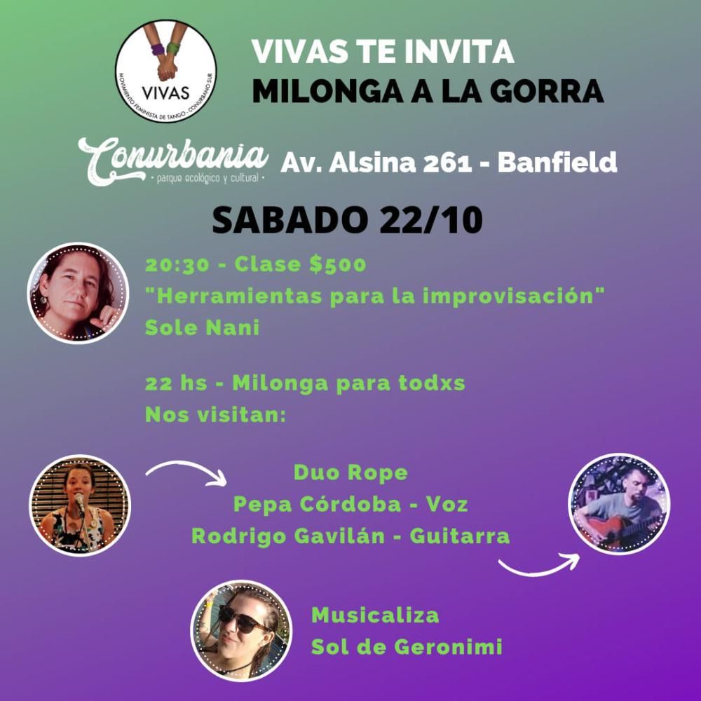 Una vez finalizada la clase, cerca de las 22 empezará la milonga propiamente dicha: en ella, el Dúo Rope, integrado por "Pepa" Córdoba (voz, también perteneciente a VIVAS) y Rodrigo Gavilán (guitarra), deleitarán al público con todo su talento. Una vez finalizado el show se pasará la gorra para que los espectadores puedan colaborar con los artistas en caso de que lo deseen.
