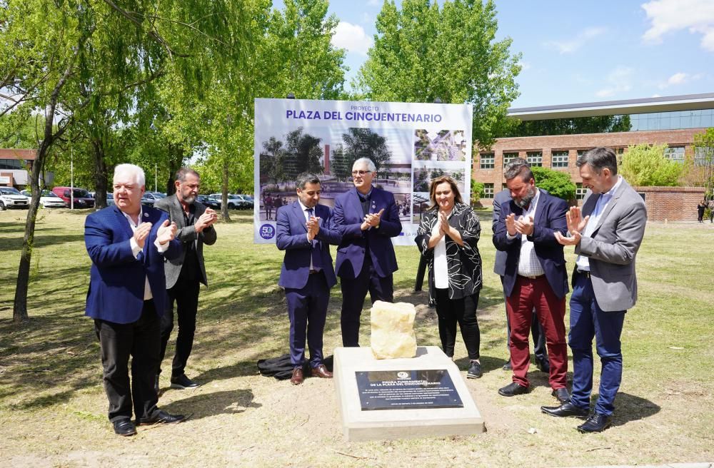 La ceremonia continuó con el descubrimiento de la Piedra Fundamental de la Plaza del Cincuentenario. La obra comenzará en las próximas semanas y se transformará en un espacio de encuentro en el centro del campus.
