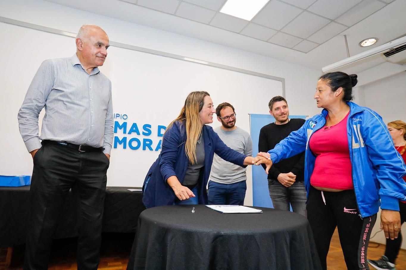 "Firmamos convenios de microcréditos junto a 73 familias del barrio La Cava de Fiorito que les dará la posibilidad de realizar mejoras habitacionales en sus viviendas. En el marco del Programa Financiamiento de Mejoras de Hábitat del Ministerio de Desarrollo de la Comunidad, se brindan las herramientas necesarias para que cada vecino y vecina pueda tener una vivienda cada día mejor para completar la urbanización integral del barrio", señaló la intendenta Marina Lesci, quien encabezó el acto en el Salón Eva Perón.