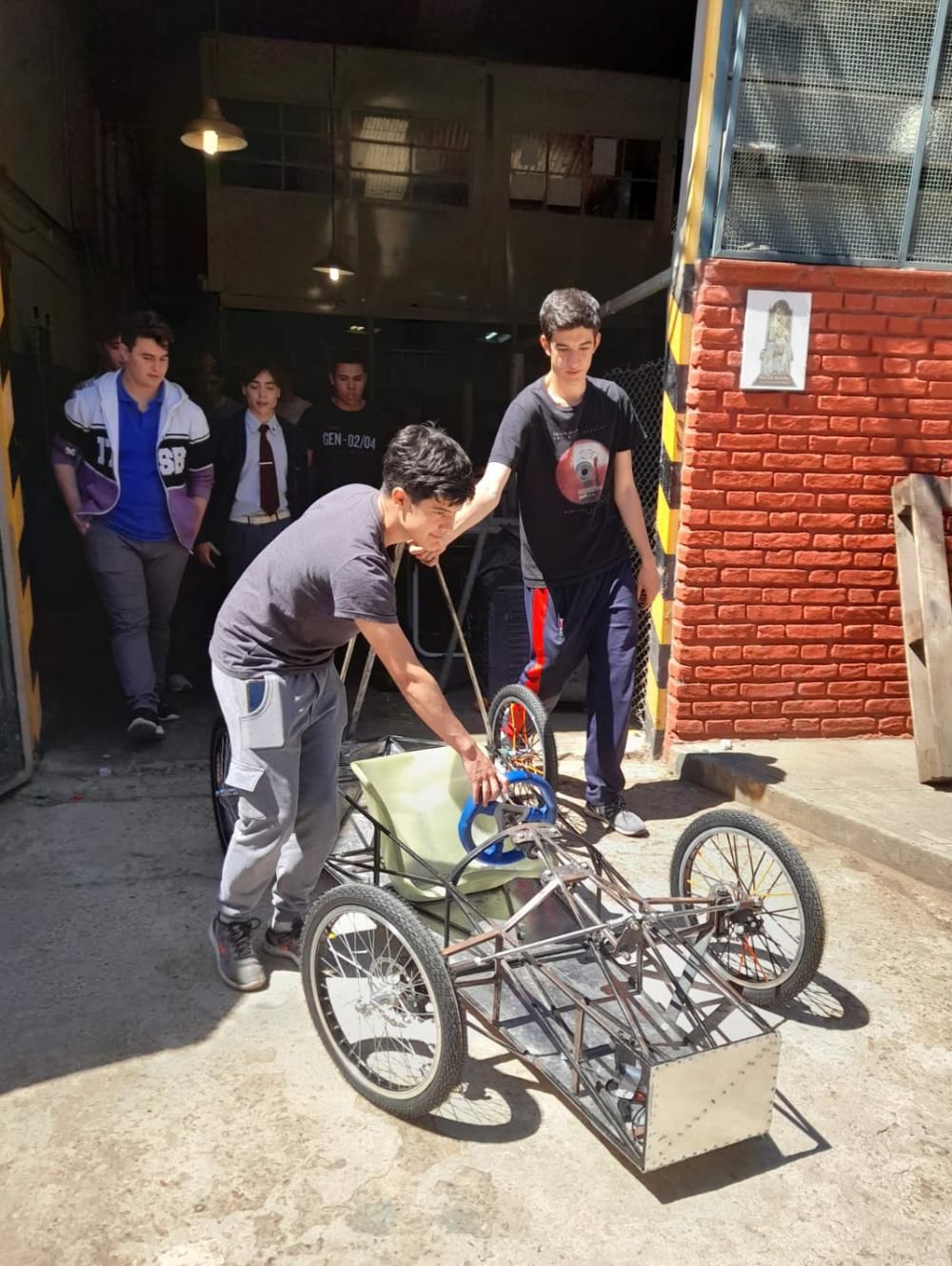 La carrocería del auto creado por los estudiantes del San Bonifacio es de caño estructural con chapa galvanizada. Cuando esté finalizado, puede llegar a tener una velocidad promedio de entre 50 y 60 km/h, aunque este factor depende del diseño.