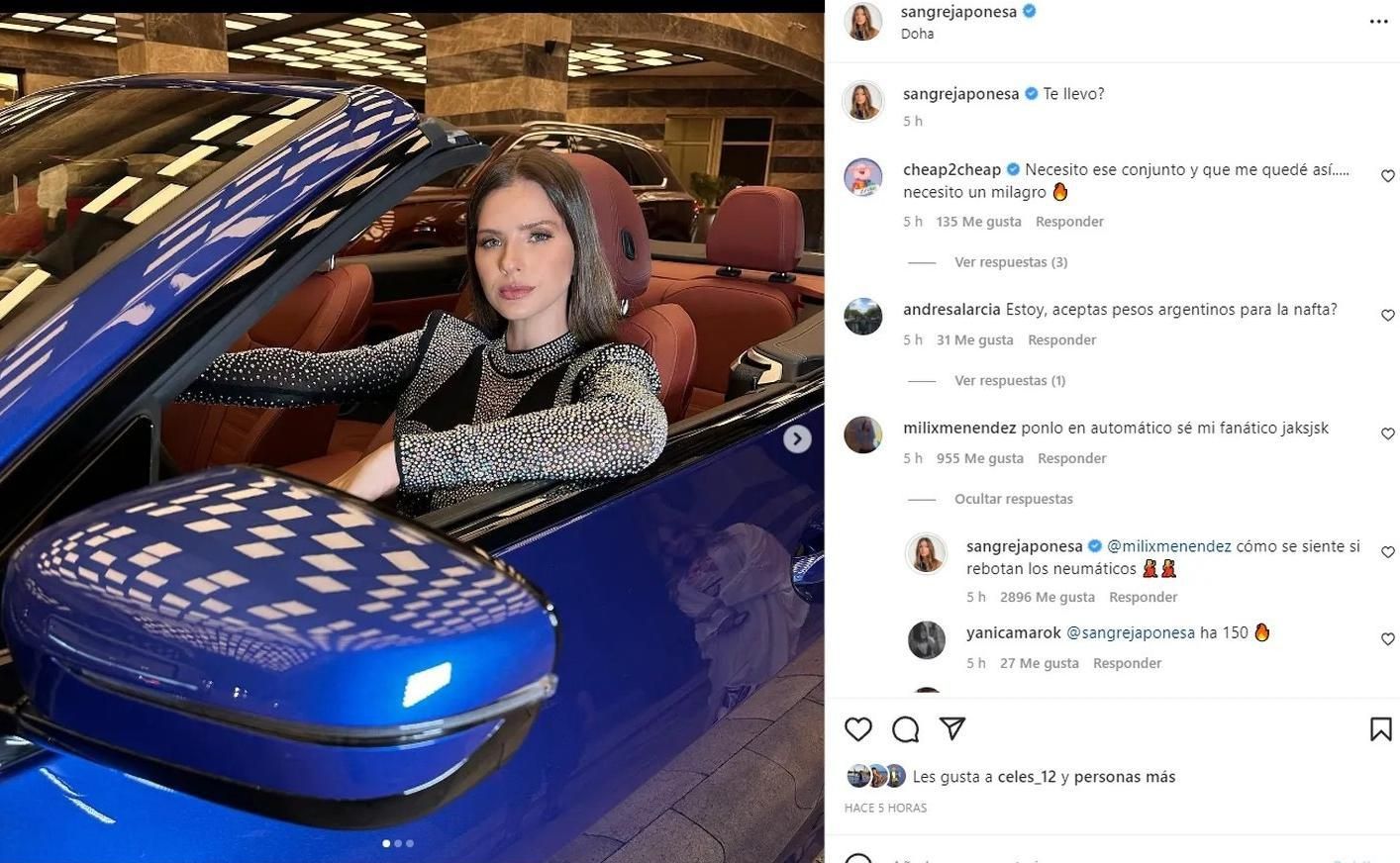 Desde Doha, la capital de Qatar, la China compartió una serie de fotografías que se tomó en un auto de alta gama. "¿Te llevo?", escribió y una de sus seguidoras, comentó el posteó con una frase de Automático, uno de los últimas temas que lanzó María: "Ponlo en automático, sé mi fanático". Y lejos de dejarlo pasar, la expareja de Benjamín Vicuña respondió con buena onda y continuó con la letra de la canción: "Como se siente si rebotan los neumáticos".