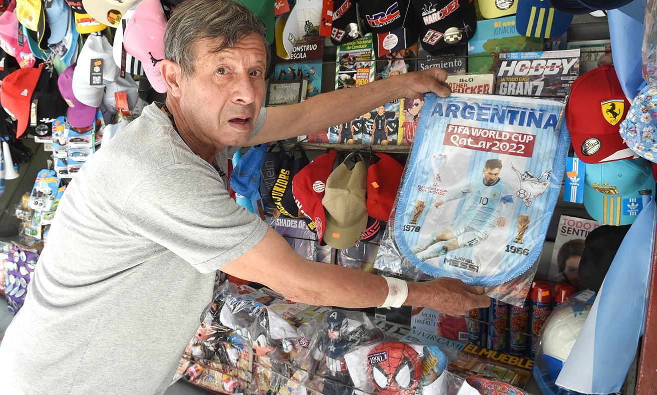 Víctor Giménez trabaja hace 25 años en el puesto ubicado en la esquina de Laprida e Yrigoyen, por lo que "ya viví varios mundiales como comerciante" y explicó que este año fue un furor la venta de merchandising para alentar a la Selección Argentina: "La gente está descontrolada por todo lo relacionado al Mundial, sobre todo por las figuritas. No solamente los chicos, sino también los grandes".