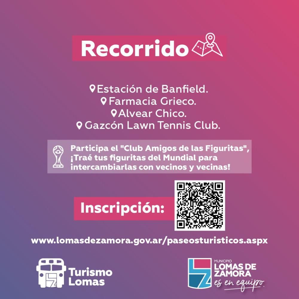 Los clásicos recorridos por las localidades lomenses, que son organizados por Turismo Lomas, se sumaron al fervor mundialista: el próximo lunes 21 de noviembre, desde las 15, se llevarán a cabo visitas guiadas por puntos emblemáticos de Banfield Oeste, con la particularidad de que cada recorrido saldrá desde el polo gastronómico de Alvear y French: allí, el kiosco Alvear Chico Drugstore es reconocido por ser punto de intercambio de figuritas, donde asisten grandes y chicos en busca del sueño de completar el álbum.