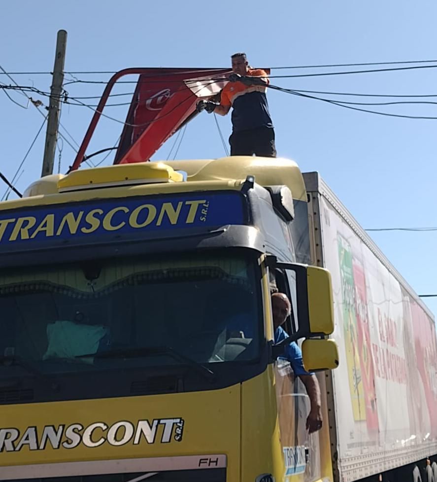 Para realizar esta tarea, Defensa Civil tuvo la gran ayuda de otro camionero que pasaba por el lugar y les ofreció subirse al techo del vehículo para que pudieran llegar más fácilmente a los cables y al cartel.