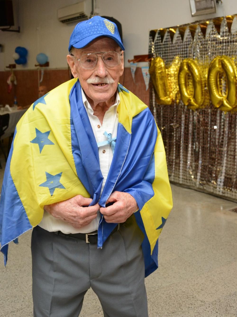 Con la bandera de Argentina y su gorra de Boca Juniors decidió hacer su entrada al Centro de Jubilados Manuel Fernández de Remedios de Escalada al que pertenece desde hace más de 40 años y donde quiso hacer el festejo de sus 100 años.