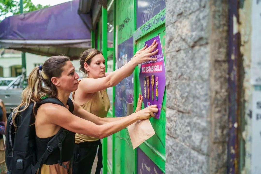 "Junto a la artista Florencia Menéndez colocamos carteles y pinceles que fueron intervenidos con caras de mujeres. El objetivo fue construir y marcar el recorrido que deben realizar desde la estación para llegar al Vagón de la Red de Asistencia Integral, donde hay equipos interdisciplinarios que brindan asesoramiento, contención y también funcionan allí grupos de ayuda mutua", informaron desde la Secretaría de Mujeres, Géneros y Diversidad.