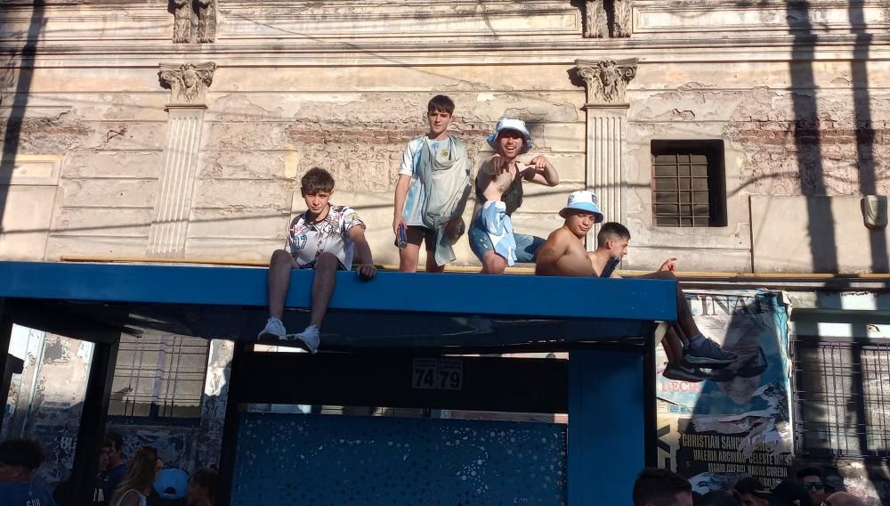 Pero sin dudas, el momento de delirio máximo lo tuvieron los jóvenes que se treparon al techo de la farmacia de Maipú y Alsina. Primero se animó uno solo, que estuvo un buen rato agitando sus brazos y cantando desde una importante altura, mientras miles de hinchas acompañaban los cánticos. Más tarde se le sumaron decenas de personas.