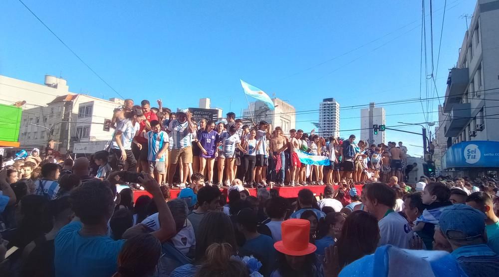 En medio de esa locura por la tercera estrella del mundo, no fueron pocos los vecinos que se animaron a celebrar desde las alturas. La iniciativa la tomaron los dos camiones que se estacionaron sobre Maipú y Alsina, en Banfield Este: cientos de vecinos se subieron a la caja de un vehículo y al techo del otro, saltando y cantando sin parar.