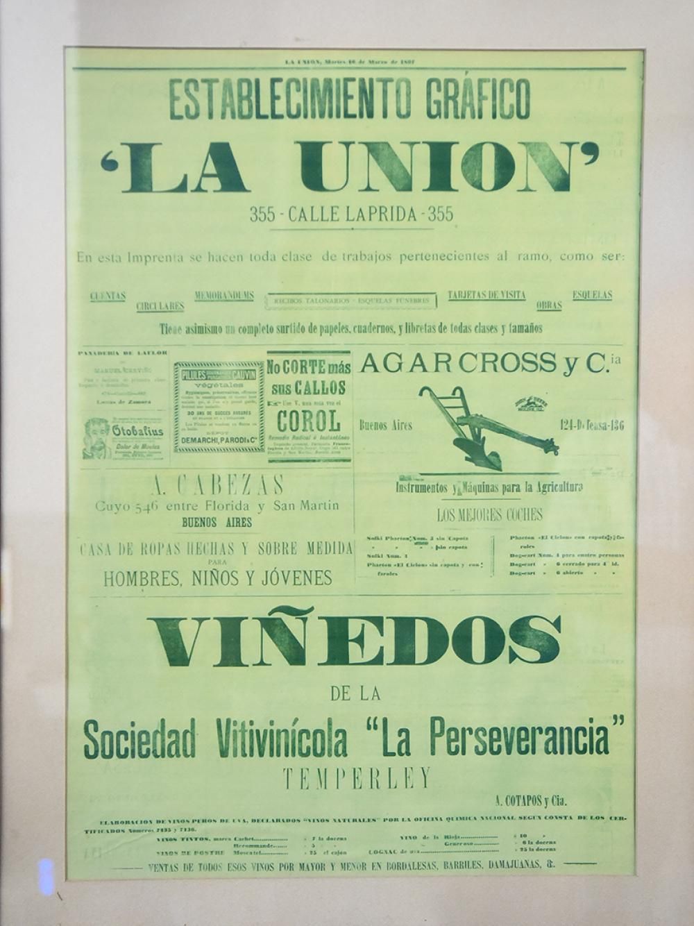 La revista 'El sudamericano', de 1889, habla sobre la compañía vitivinicultora La Perseverancia. Allí se menciona que en estas tierras de Temperley había un extenso viñedo de ocho cuadras, con 60 mil plantas de viña americana y francesa.