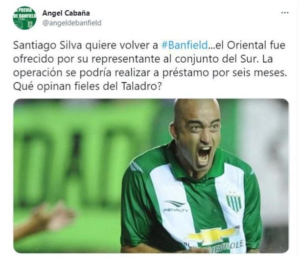 "Santiago Silva quiere volver a Banfield...el Oriental fue ofrecido por su representante al conjunto del Sur. La operación se podría realizar a préstamo por seis meses. Qué opinan fieles del Taladro?", publicó en redes sociales.