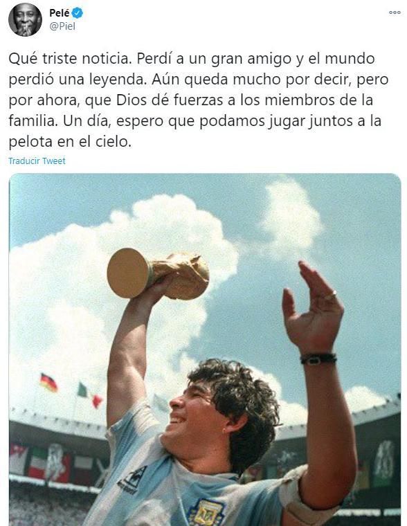 "Qué triste noticia. Perdí a un gran amigo y el mundo perdió una leyenda. Aún queda mucho por decir, pero por ahora, que Dios dé fuerzas a los miembros de la familia. Un día, espero que podamos jugar juntos a la pelota en el cielo", escribió Pelé en aquella triste jornada de la muerte de Maradona.
