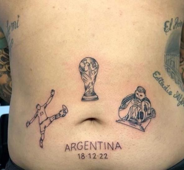 Trabajar en bata no fue lo único que hizo Casu por amor a la Selección. Dos días después de la final, se hizo varios tatuajes en la panza: Lionel Messi besando la Copa del Mundo, la fecha de la consagración, el trofeo y la ataja del "Dibu" Martínez en el último minuto del alargue, en el infartante mano a mano con Randal Kolo Muani.