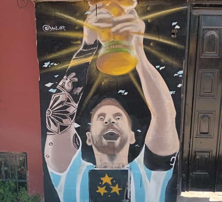 El mural de Messi y Álvarez lo hice gracias a una vecina que me permitió pintar en su pared. Decidí poner también a Julián por el mundial que hizo, siendo el primero que juega, y los goles que metió.