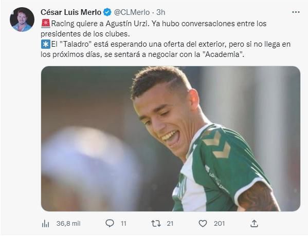 Teniendo en cuenta esto, y de acuerdo a lo que informó el periodista Cesar Merlo, ya hubo un contacto entre Víctor Blanco, presidente de Racing, y Eduardo Spinosa, máxima autoridad del Taladro, para iniciar conversaciones por Urzi. Sin embargo, por el momento, la idea de la dirigencia de Banfield es venderlo al exterior, aunque hasta el momento no apareció ningún interesado por adquirir los servicios del extremo.