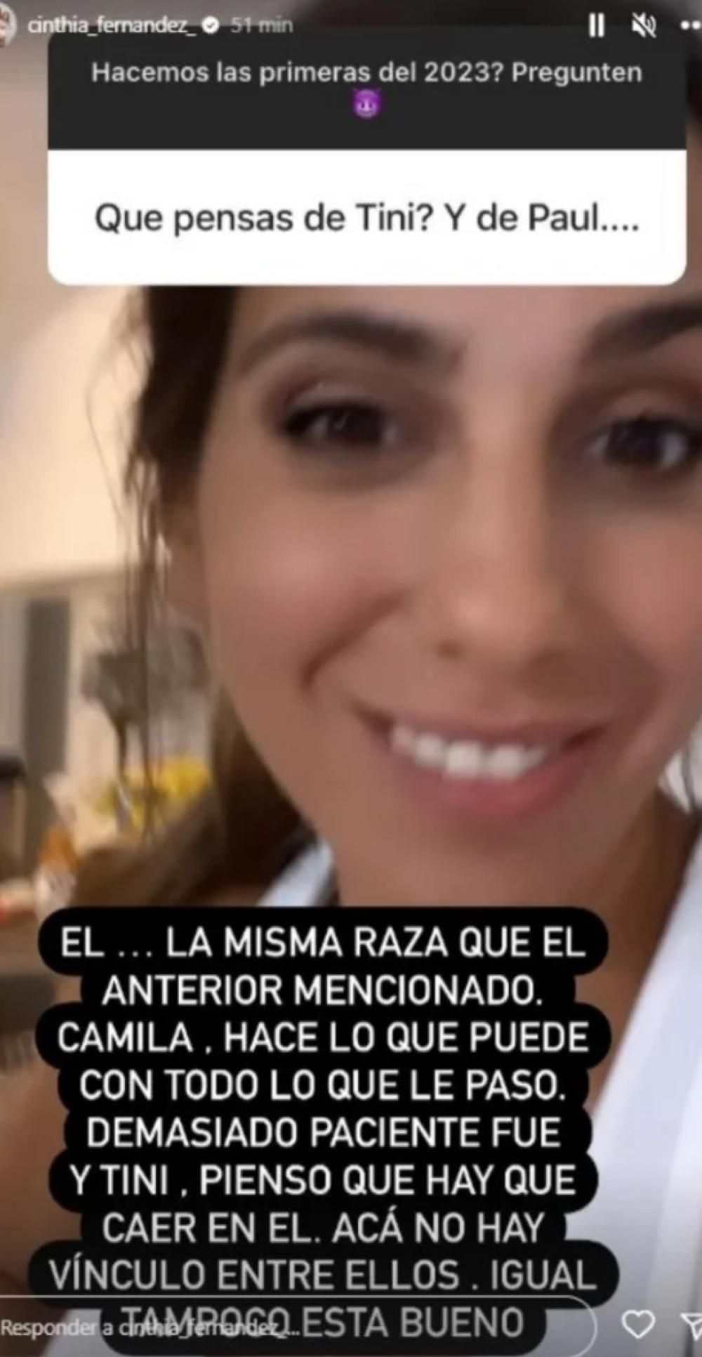 "Él es la misma raza que el anterior mencionado (Matías). Camila hace lo que puede con todo lo que le pasó, demasiado paciente fue. Y Tini, pienso que hay que caer en él... Acá no hay vínculo entre ellos. Igual, tampoco está bueno", sentenció a través de sus stories dando a entender que los futbolistas serían todos iguales.