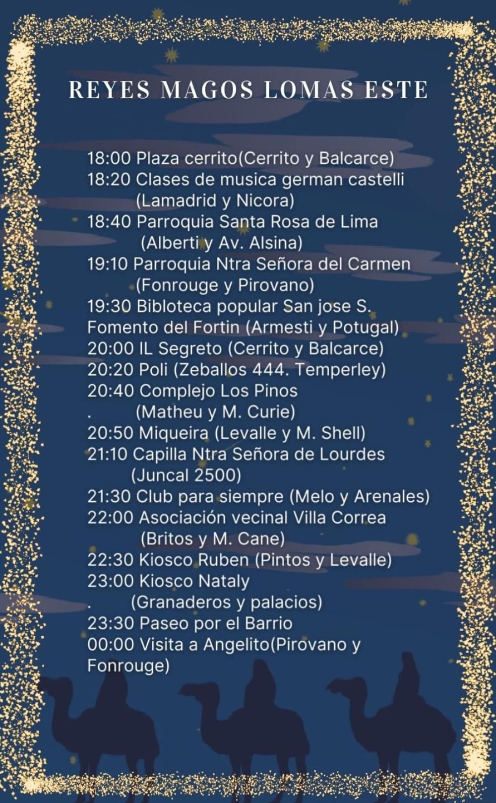 Como hace 42 años, los vecinos de Lomas Este ya se encuentran en plena organización para lo que será la Caravana de Reyes, la cual se llevará a cabo el próximo jueves 5 de enero a partir de las 18. Los magos provenientes de Oriente recorrerán las calles del barrio repartiendo alegría con todos los vecinos. Una sana costumbre, a pulmón, que se mantiene vigente hasta estos días.