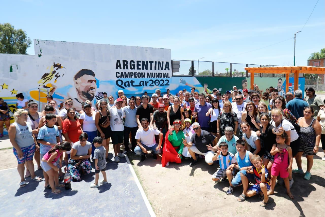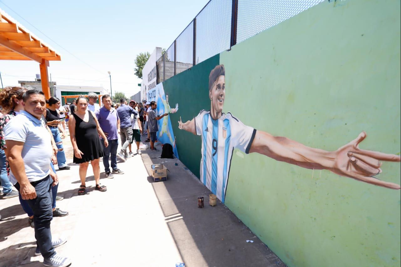 Chicos y grandes disfrutaron de la jornada y se sacaron fotos con el mural que tiene a Messi levantando la ansiada Copa del Mundo; al Dibu Martínez con su épica atajada en la última jugada contra Francia; a Fideo Di María con su clásico festejo de gol; y a la Araña Álvarez celebrado uno de sus cuatro tantos en el Mundial.