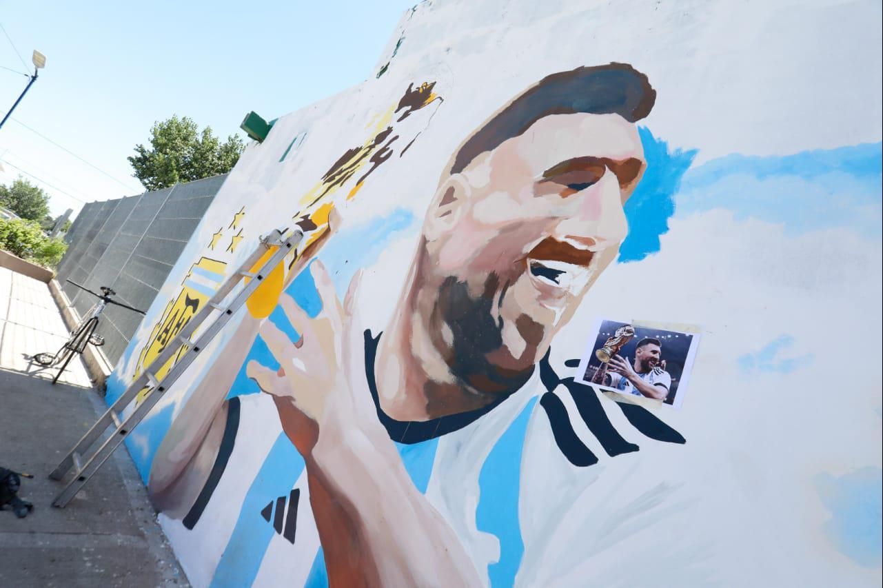 Lionel Messi, Emiliano Martínez, Ángel Di María y Julián Álvarez son los protagonistas de la imponente obra que está siendo plasmada en el paredón del espacio ubicado entre las calles Cipoletti y Claudio de Alas. "Las sensaciones que causa la Selección son impresionantes y estamos todos muy felices por este gran logro. Vecinos y muchos chicos que viven en los alrededores de la plaza estuvieron pintando con nosotros a lo largo de la semana", contó Iván Gemelli, uno de los 12 artistas a cargo del proyecto.