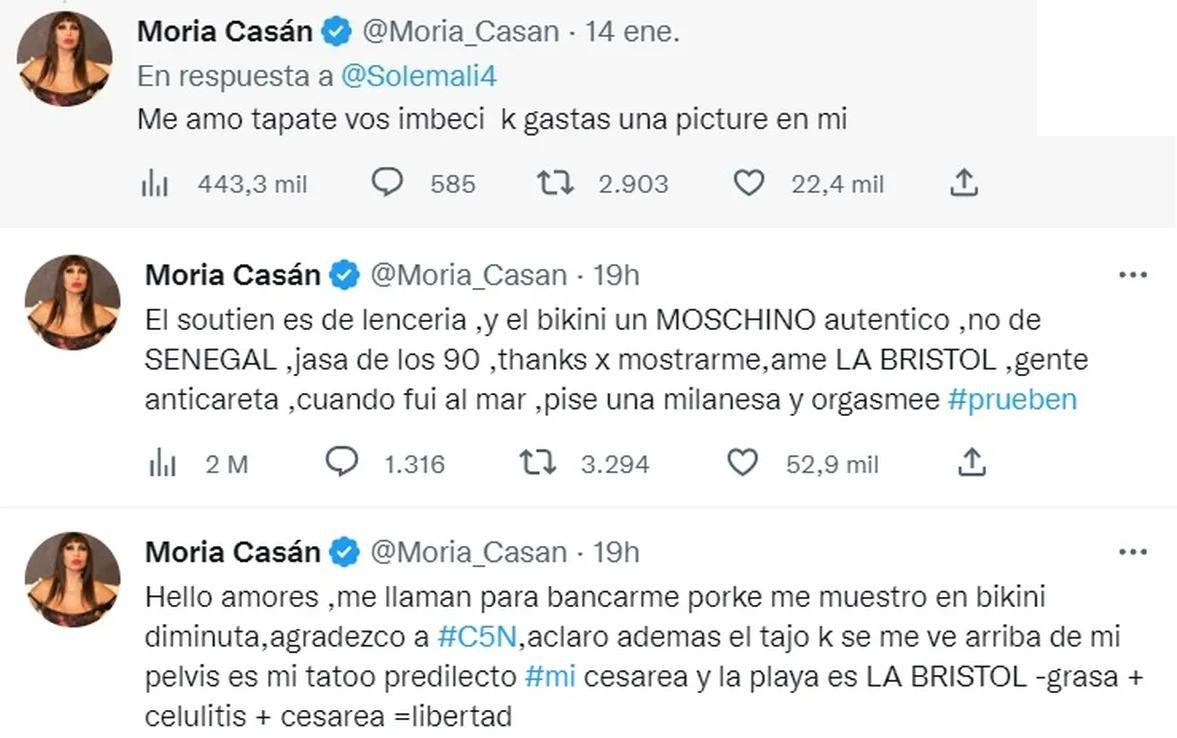 "Tapate vos, imbécil". Y posteriormente, subió en su cuenta oficial: "Hello amores, me llaman para bancarme porque me muestro en bikini diminuta. Aclaro que el tajo que se me ve arriba de mi pelvis es mi tattoo predilecto. Mi cesárea y la playa es la Bristol. Grasa + celulitis + cesárea =libertad", arrancó Moria.