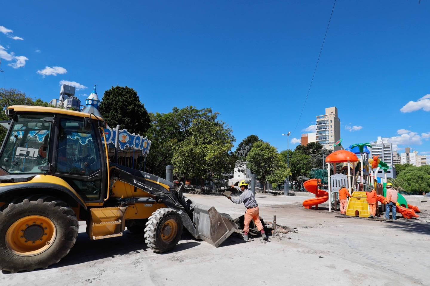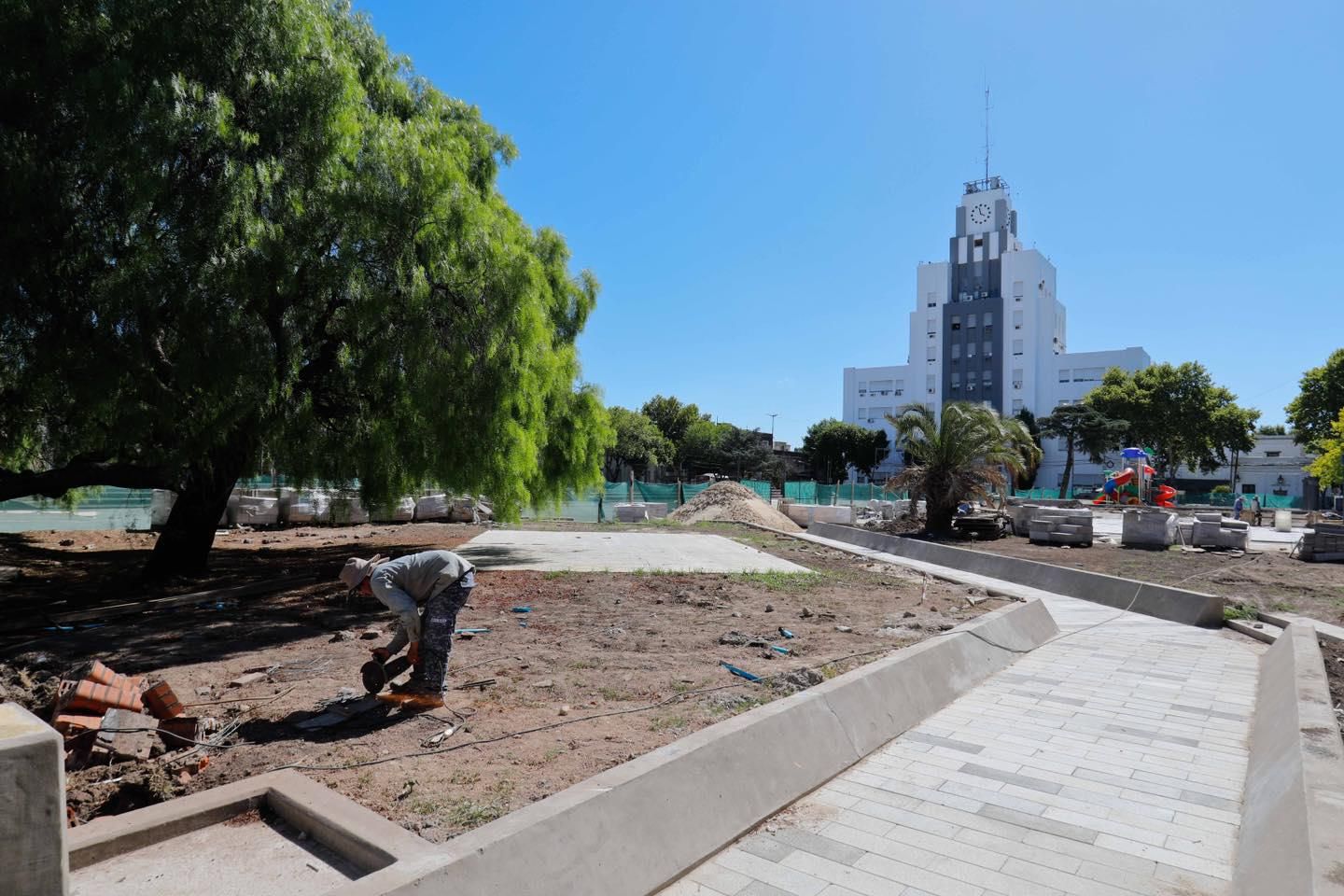 Actualmente, las cuadrillas trabajan en el sector de juegos infantiles que tendrá el piso especial para brindar protección. También están reemplazando todas las baldosas internas de la zona central.