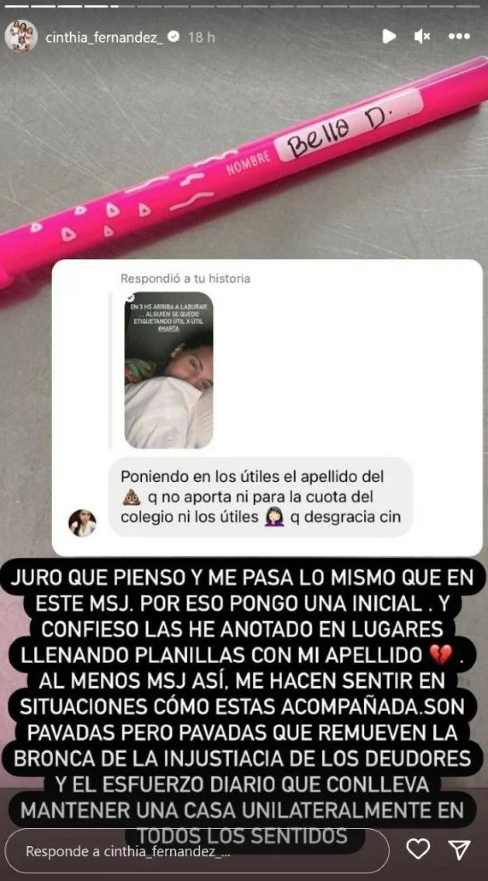 "Y, confieso que las anoté en lugares llenando planillas con mi apellido. Estas pavadas, pero pavadas que remueven la bronca de la injusticia de los deudores y el esfuerzo diario que conlleva mantener una casa unilateralmente en todos los sentidos", cerró Cinthia Fernández.
