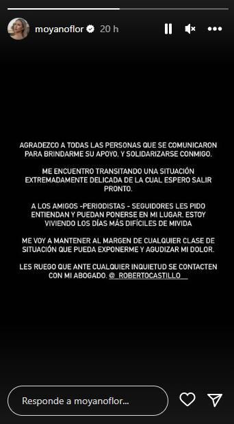 "A los amigos - periodistas - seguidores les pido entiendan y puedan ponerse en mi lugar. Estoy viviendo los días más difíciles de mi vida", agregó Flor Moyano en las últimas horas en una historia de Instagram.