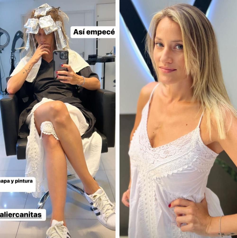 "Hoy chapa y pintura. Así empecé", fue lo primero que fue contando a través de sus historias de Instagram mientras se la veía sentada en una de las sillas del salón de belleza haciéndose mechas con papel. "Así seguí", escribió después en un video donde se lo ve al peluquero emprolijando su corte de pelo.