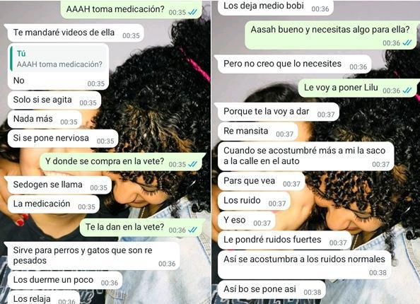 Cuando le preguntan si la gata toma medicación, ella reconoce que le suministró un sedante. "Sólo si se agita. Nada más. Si se pone nerviosa. Sedogen se llama la medicación. Sirve para perros y gatos que son re pesados. Los duerme un poco, los relaja, los deja medio bobi. Pero no creo que lo necesites porque te la voy a dar re mansita", afirma la joven en ese chat.