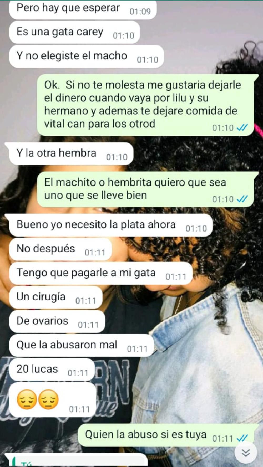Una vez más, la evidencia es clara. Una persona aportó capturas de pantalla de WhatsApp donde se lee que la joven de Turdera pide dinero por una gata gravemente herida. "Yo necesito la plata ahora, no después. Tengo que pagarle a mi gata una cirugía de ovarios, que la abusaron mal. 20 lucas", dice uno de los mensajes.