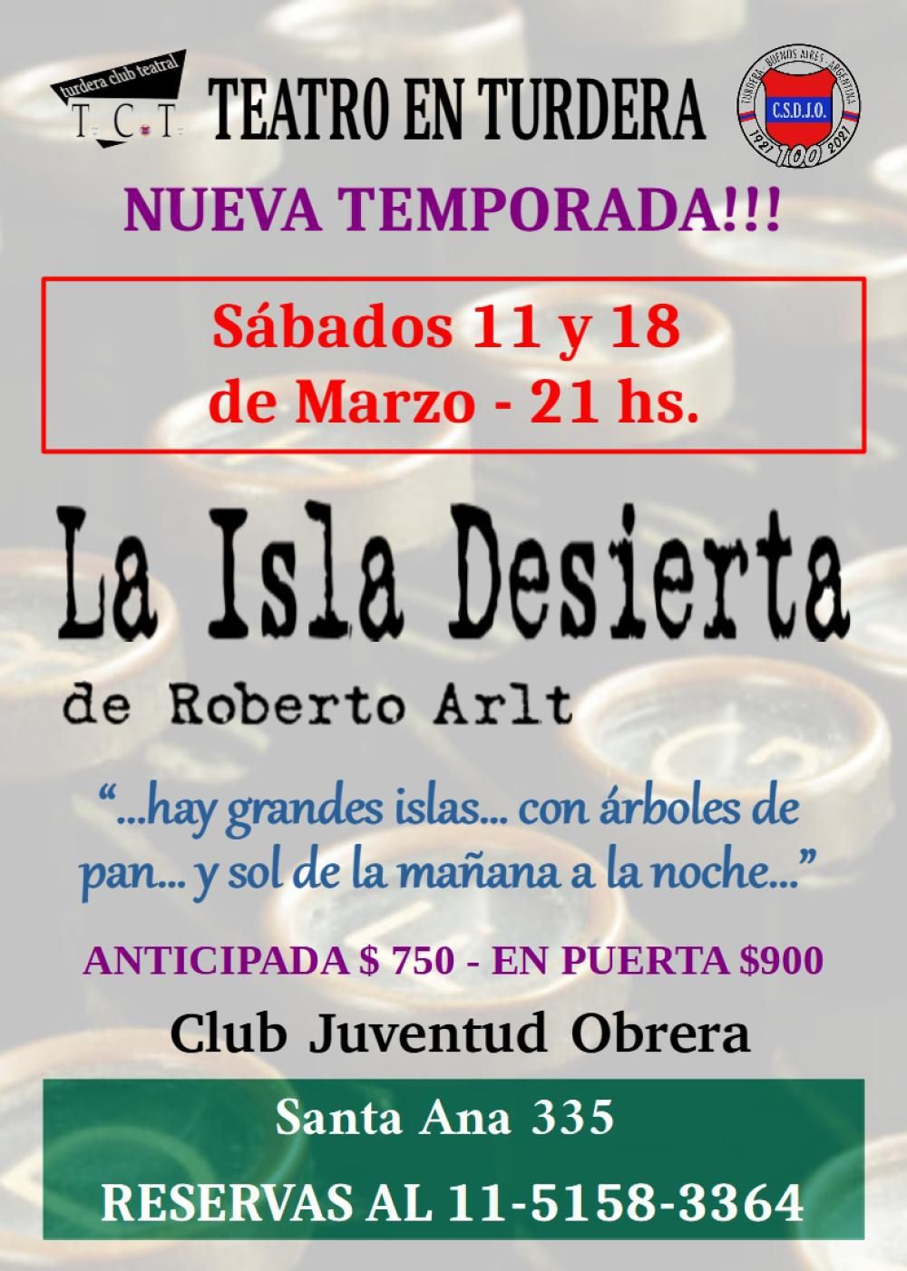 El Club Juventud Obrera de Turdera (Santa Ana 335) se prepara para arrancar el 2023 en materia de teatro y ya dispuso de fechas para las primeras funciones del año: los sábados 11 y 18 de marzo se presentará "La isla desierta", una adaptación de la obra de Roberto Arlt, mientras que el 25 de marzo harán una peña cultural para rememorar los hechos que sucedieron en la última dictadura militar en Argentina.