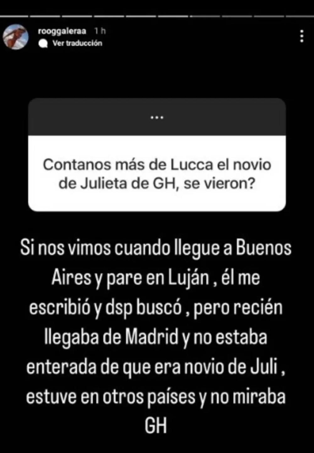 La joven en cuestión es Rocío Galera y, según contó en historias que subió a su Instagram, ella no sabía que Lucca está en pareja con Julieta.