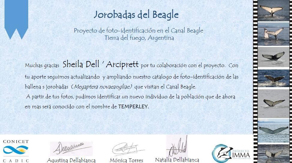 El CADIC le extendió a la fotógrafa un certificado en agradecimiento por colaborar con el proyecto. Gracias a ella, hay una nueva ballena en el catálogo oficial. Cada vez que se acerque al Canal de Beagle, allá lejos en Ushuaia, se va a escuchar el grito de los investigadores que no va a dejar dudas: "¡Es Temperley!". El barrio de Sheila la acompañó hasta el fin del mundo.