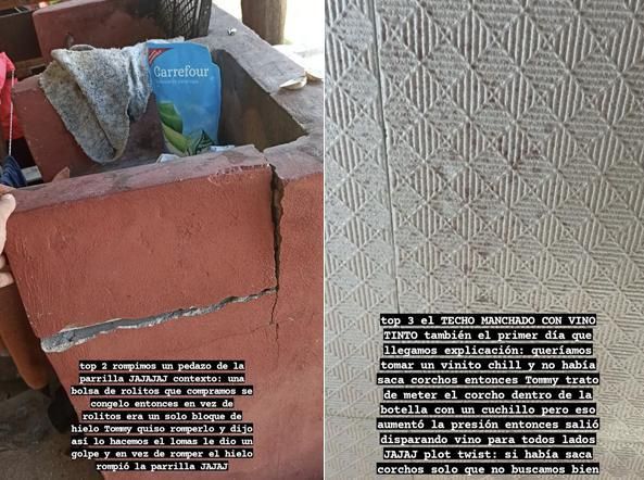 Josefina no dudó en sacar capturas para dejarlos en evidencia antes miles de usuarios. "Nos vamos a la madrugada y antes de irnos necesito mostrar el top 4 de daños al depto, por favor paciencia con este top", decía la primera historia de uno de los jóvenes, que enseguida agregó: "Rompimos un pedazo de la parrilla JAJAJAJ. Contexto: una bolsa de rolitos que compramos se congeló, entonces en vez de rolitos era un solo bloque de hielo. Tommy quiso romperlo y dijo 'así lo hacemos en Lomas'. Le dio un golpe y en vez de romper el hielo rompió la parrilla JAJAJ".