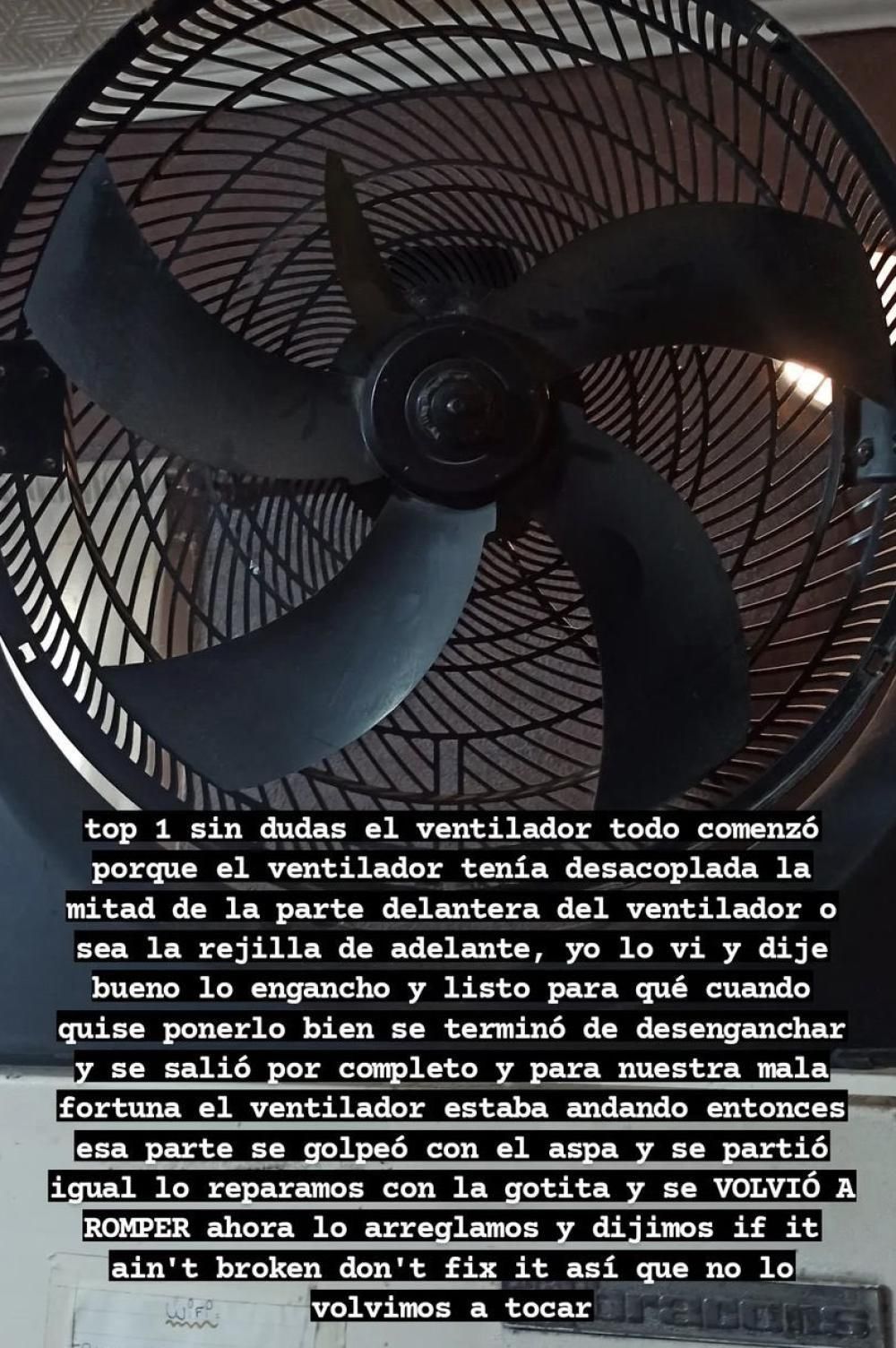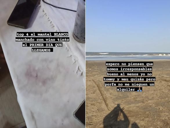 La siguiente historia mostraba el techo del departamento manchado con vino tinto, situación que según los inquilinos sucedió el día que se instalaron en Mar del Tuyú. "Queríamos tomar un vinito chill y no había saca corchos, entonces Tommy trató de meter el corcho dentro de la botella con un cuchillo pero eso aumentó la presión, entonces salió disparando vino para todos lados JAJAJ", se burlaba el joven, que en otra historia mostraba un mantel blanco también manchado con esa bebida y un ventilador destrozado.
